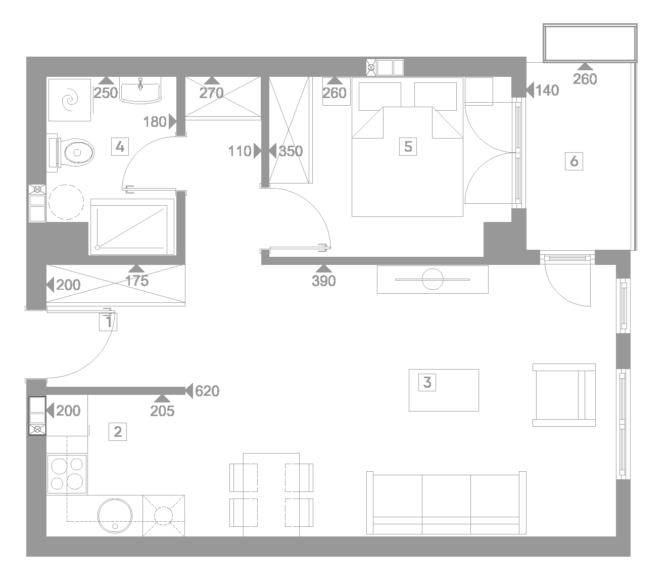 Стан бр. 5.38 Влезен хол 3.45 m² Кујна 4.00 m² Дневен престој 27.0 m² Бања 4.22 m² Спална соба 8.77 m² Тераса 3.04 m² вкупна квадратура 50.48 m² Резервирај термин Резервирај термин